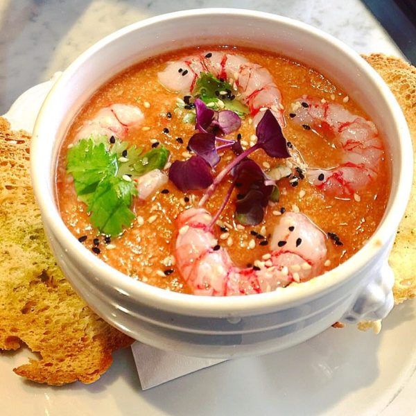 Gazpacho di pesce, tartare di gamberi al lime