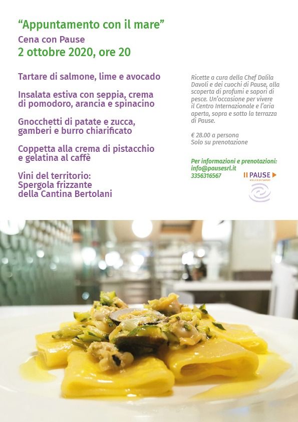 venerdì 2 ottobre non mancate alla cena di mare a PAUSE Atelier dei Sapori. Il costo per persona è di 28€, VINO INCLUSO. Prenotazione entro il 30 settembre a info@pausesrl.it o 335 631 6567